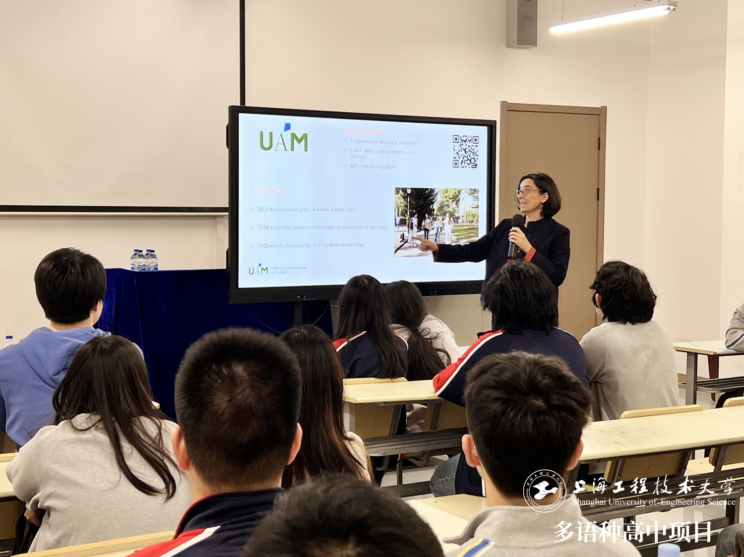 本周,公立馬德里自治大學(Universidad Autónoma de Madrid)的Irene Martín副校長親臨本校,為上海工程技術大學多語種高中項目西班牙語班同學展開升學講座。