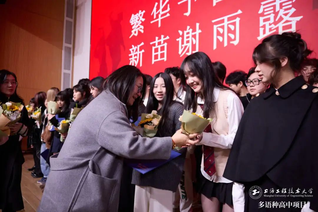 回顧過去的歲月,同學們收獲了知識,更收獲了寶貴的人生經驗。在這個離別之際,上海工程技術大學繼續教育學院吳剛副院長、上海工程技術大學多語種高中項目總負責人葉宇宏老師,為畢業生們送上臨別寄語。飽含深情的話語既總結了同學們的成長歷程,也對大家的過往努力給予肯定,諄諄教誨猶如盞盞明燈,為即將踏上新征程的畢業生們,照亮前行的道路,激勵著大家在未來的道路上奮勇前行。