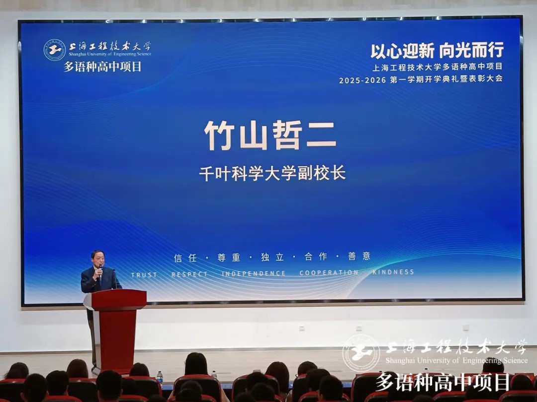 上海工程技術大學繼續教育學院吳剛副院長、學院老師代表,及多語種高中項目全體師生近300人齊聚現場,共啟新學年。本次活動還邀請了日本千葉科學大學副校長竹山哲二先生作為特別嘉賓到校出席。