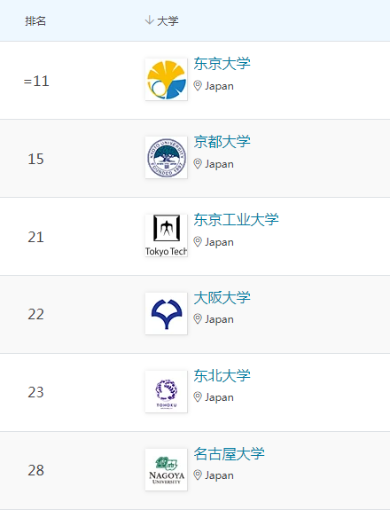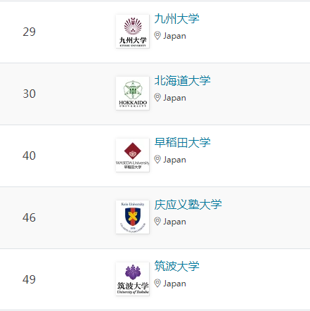 在本次的排名榜單中,日本共有108所高校上榜,其中有2所高校進入TOP20,進入TOP100的高校共有14所。