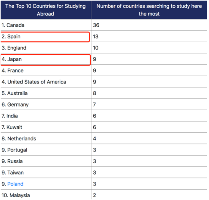 國(guó)際金融服務(wù)公司Remitly通過(guò)谷歌搜索數(shù)據(jù),分析了164個(gè)國(guó)家/地區(qū)的居民搜索留學(xué)目的地的情況。全球最想去的留學(xué)國(guó)家/地區(qū)排名:西班牙,榮登第2位排名;日本則排位第4,超過(guò)法、美、澳、德等國(guó)家。