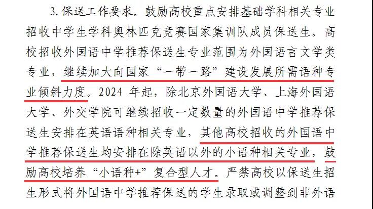 2、“2024年起,除北京外國語大學、上海外國語大學、外交學院可繼續招收一定數量的外國語中學推薦保送生安排在英語語種相關專業,其他高校招收的外國語中學推薦保送生均安排在除英語以外的小語種相關專業,鼓勵高校培養“小語種+”復合型人才。”