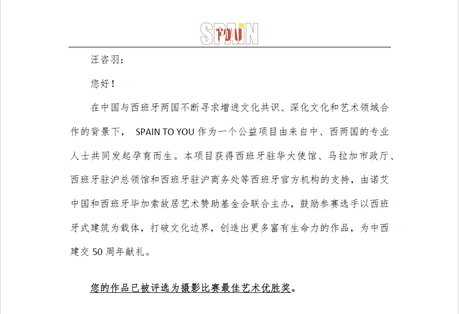 祝賀2022級2班汪咨羽同學在Spain To You 2023活動中獲得攝影比賽最佳藝術優勝獎!
