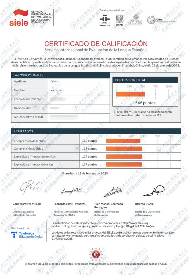 ▲ 錢元元同學(xué)已順利通過西語B1等級考試