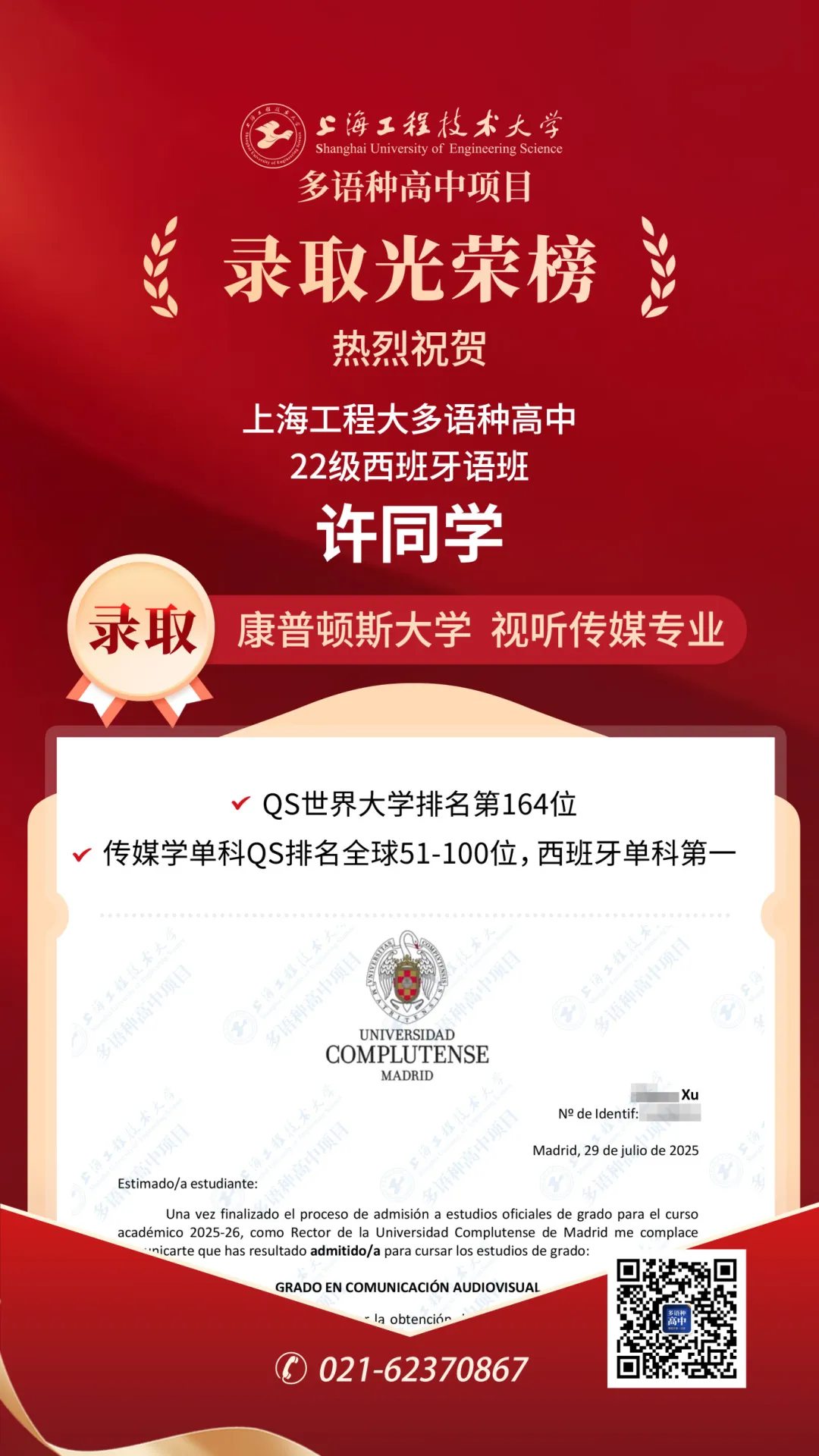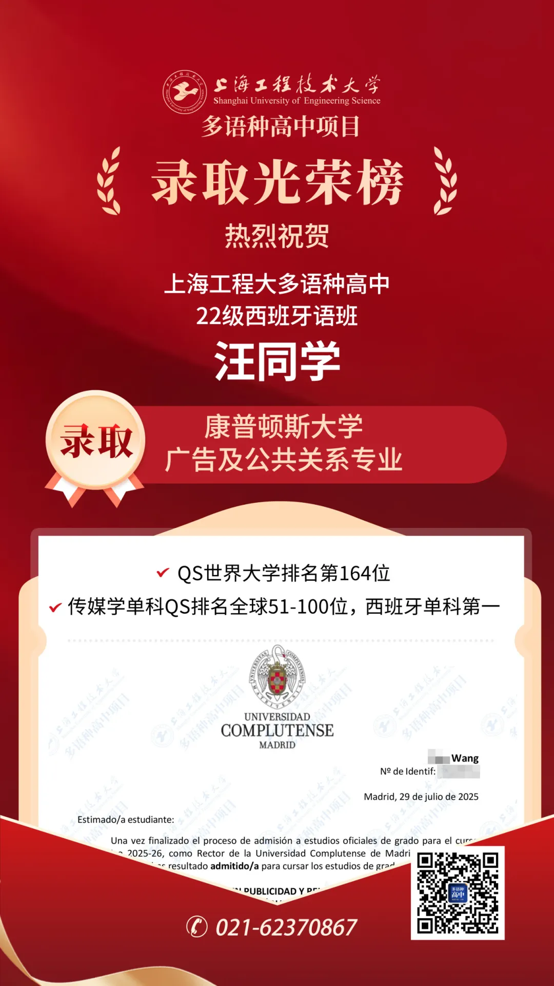 重磅喜訊! 上海工程大多語種高中22級西班牙語班捷報(bào)頻傳!汪同學(xué)與許同學(xué)憑借卓越的綜合實(shí)力,雙雙斬獲西班牙頂尖學(xué)府——馬德里康普頓斯大學(xué)(Universidad Complutense de Madrid, UCM) 的熱門專業(yè)錄取!汪同學(xué)成功錄取廣告及公共關(guān)系專業(yè);許同學(xué)則成功錄取視聽傳媒專業(yè),兩位同學(xué)均榮獲70%的高額獎(jiǎng)學(xué)金。熱烈祝賀兩位同學(xué)!