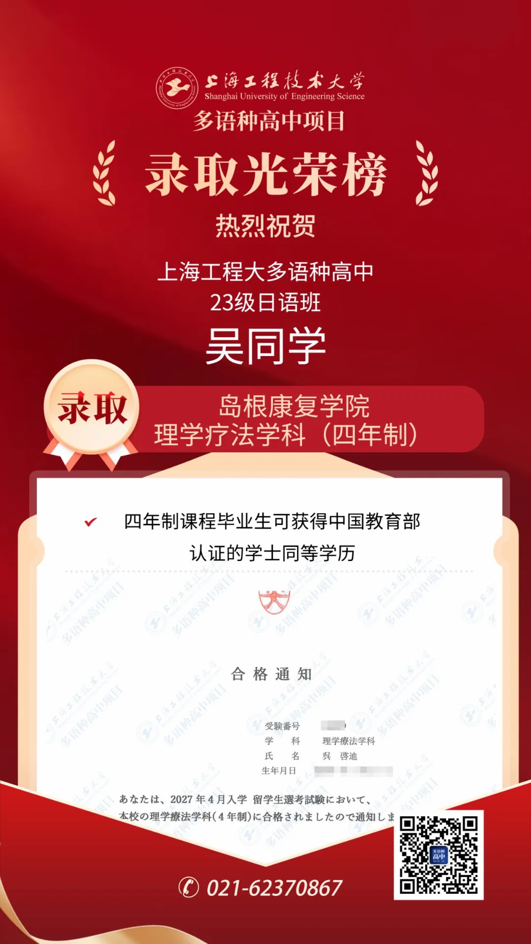 “兒子想過著有價值的人生,并且擁有了人生的目標(biāo)。”——這是上海工程技術(shù)大學(xué)多語種高中23級日語班吳啟迪同學(xué)家長的由衷感慨。如今,這個目標(biāo)正在清晰的化為現(xiàn)實:近日,我校高三學(xué)生吳啟迪憑借卓越的日語能力與清晰的職業(yè)規(guī)劃,在高三上學(xué)期成功斬獲日本島根康復(fù)學(xué)院的錄取通知書,比常規(guī)升學(xué)路徑整整提前了一年,激動人心地叩開了夢想之門。