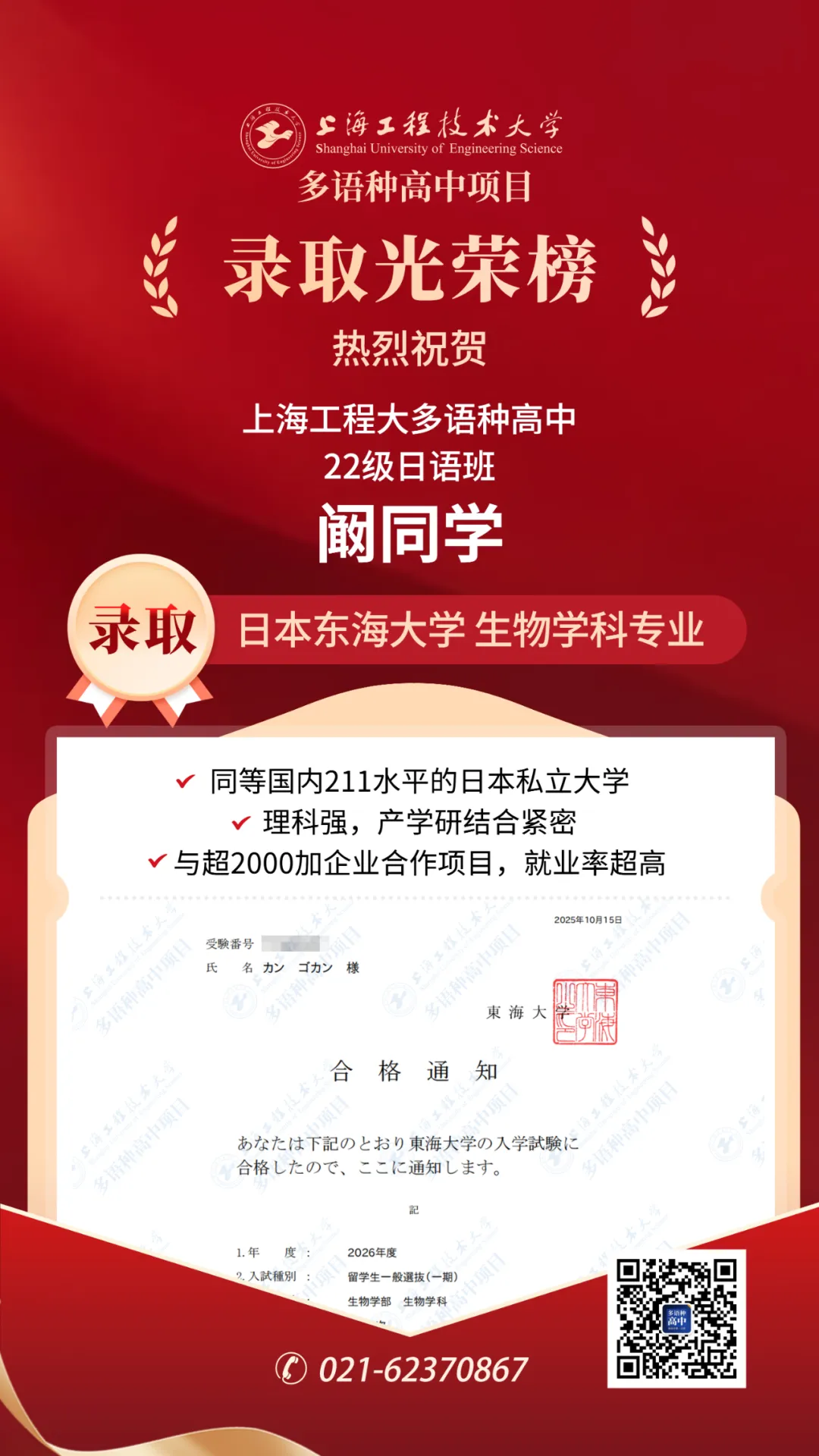 近日,上海工程技術大學多語種高中項目頻頻收到來自日本的好消息!闞同學與李同學作為我校22級畢業生,赴日后僅半年不到便收獲大學錄取Offer,為升學之路交出亮眼答卷!