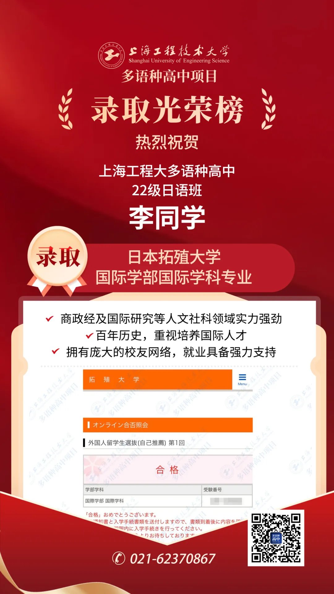恭喜李同學錄取日本拓殖大學國際學部國際學科專業