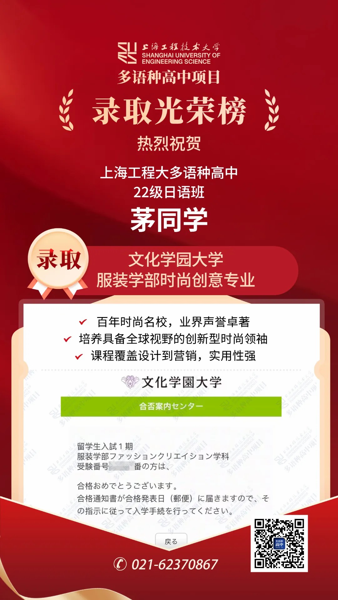 茅同學在出國前已達到日語N2以上水平,高效的語言能力為其在日適應學習節奏、專注備考節省了大量時間與精力,最終以扎實的語言功底與出色的專業素養,順利叩開文化學園大學的校門,即將在時尚創意領域開啟全新求學之旅!